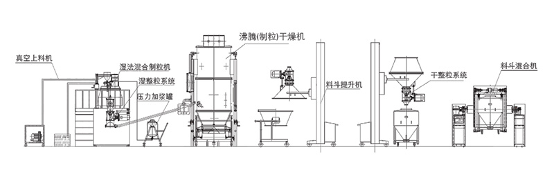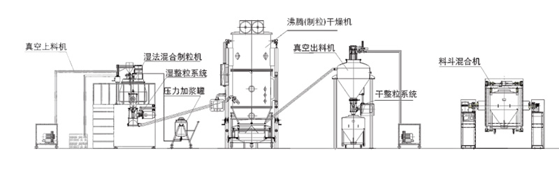 物料稱(chēng)量后通過(guò)真空上料機(jī)將物料負(fù)壓吸入到濕法混合制粒機(jī)中,粘合劑液體通過(guò)壓力加漿罐、噴槍霧化進(jìn)入濕法混合制粒機(jī)中與細(xì)粉混合制成軟材,同時(shí)經(jīng)過(guò)制粒刀將軟材制成濕顆粒,濕顆粒通過(guò)濕整粒機(jī)整粒均勻后,在沸騰干燥機(jī)的真空負(fù)壓作用下,將整粒好的濕顆粒吸入沸騰干燥機(jī)內(nèi)進(jìn)行干燥,干燥好的物料通過(guò)真空出料機(jī)出料井進(jìn)行干整粒后進(jìn)入到料斗混合機(jī)內(nèi)進(jìn)行總混,然后再進(jìn)入其它工序。
